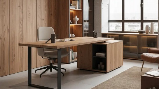 Já os escritórios ganham força com a presença da madeira natural, simetria nas proporções e detalhes discretos inspirados na antiguidade — criando um espaço que favorece concentração, rotina e bem-estar.